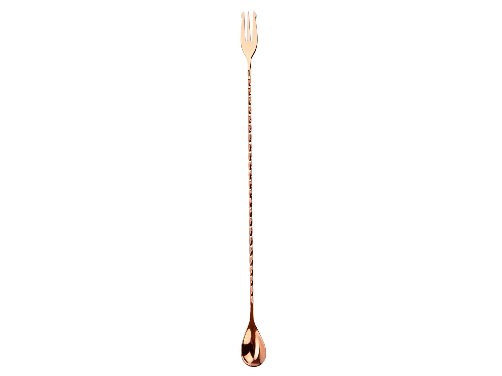 Lang og flot barske med snoet skaft og gaffel i enden. Med denne barske for du både et godt redskab i baren og lidt bling, da de flotte kobberbelægning giver et elegant look. Det snoede skaft gør det nemt at svinge barskeen rundt i mixing glasset eller cocktailen, så du kan få nedkølet cocktailen og mixet ingredienserne godt rundt. Det lange skaft er også oplagt at bruge når du skal hælde kulsyreholdige drikke i din cocktail, da man ved at hælde langsomt ned at skaftet får undgået for meget plask - og bevarer derved mere kulsyre.
